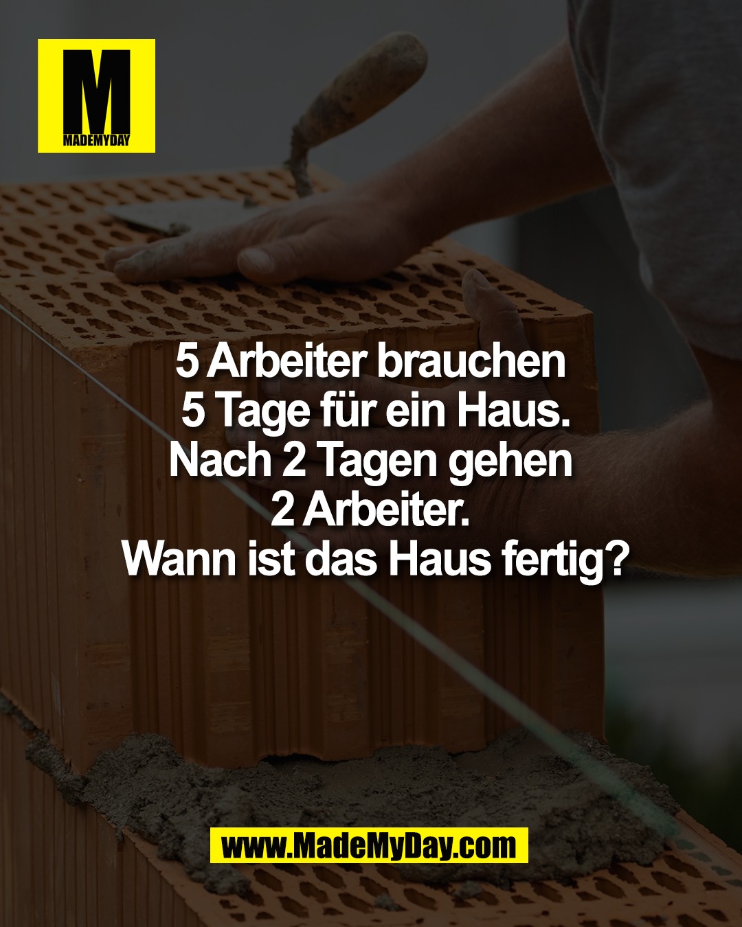 Eine einfache Dreisatz-Aufgabe der Art so wie ich sie in meinem Einstellungstest zum Sozialversicherungsfachangestellten auch bearbeiten musste. Hätte ich das Wissen diesbezüglich einen Tag vorher nicht aufgefrischt, hätte ich das eh nicht lösen können. 😅 Gesamtarbeit: 5 Arbeiter x 5 Tage = 25 Arbeiter-Tage Arbeit in den ersten 2 Tagen: 5 Arbeiter x 2 Tage = 10 Arbeiter-Tage Verbleibende Arbeit: 25 - 10 = 15 Arbeiter-Tage Danach arbeiten nur noch 3 Arbeiter: 15 / 3 = 5 Tage Gesamtdauer: 2 Tage + 5 Tage = 7 Tage