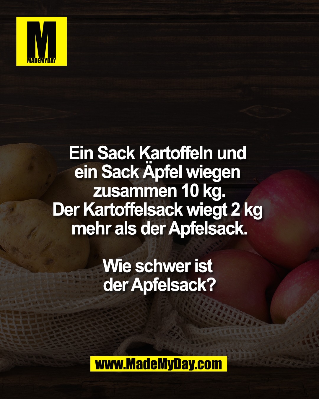 Hätte zuerst auch auf 6 und 4 getippt mit den Sack voller Äpfel und Kartoffeln. Aber ich glaube das ist eine Fangfrage, seht euch doch die Wörter mal genau an... 😉 Am Ende wird gefragt wie schwer der Apfelsack wiegt, also der Sack alleine 😉